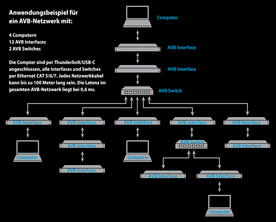 Die Latenz der AVB-Interfaces liegt bei extrem niedrigen 0,625 ms, selbst wenn Netzwerkkabel von mehreren hundert Metern Länge benutzt werden.